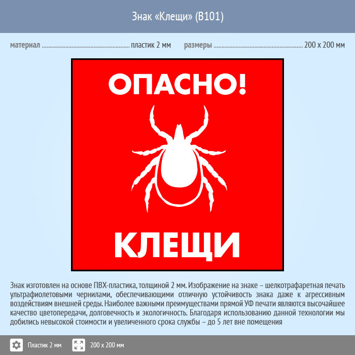 Знак «Опасно! Клещи», B101 (пластик, 200х200 мм) в Ижевске купить