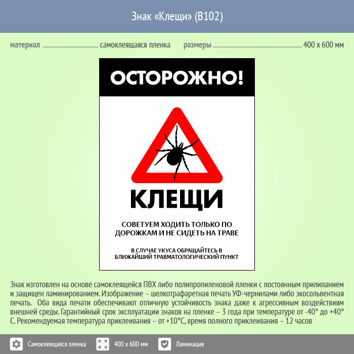Знак «Осторожно! Клещи», B102 (пленка c ламинированием, 300х400 мм) в Ижевске купить