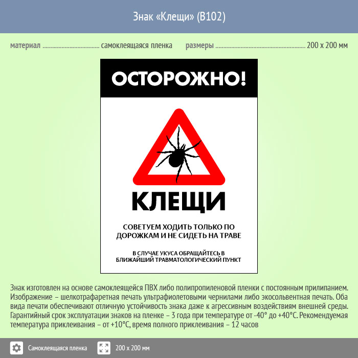 Знак «Осторожно! Клещи», B102 (пленка, 400х600 мм) в Ижевске купить