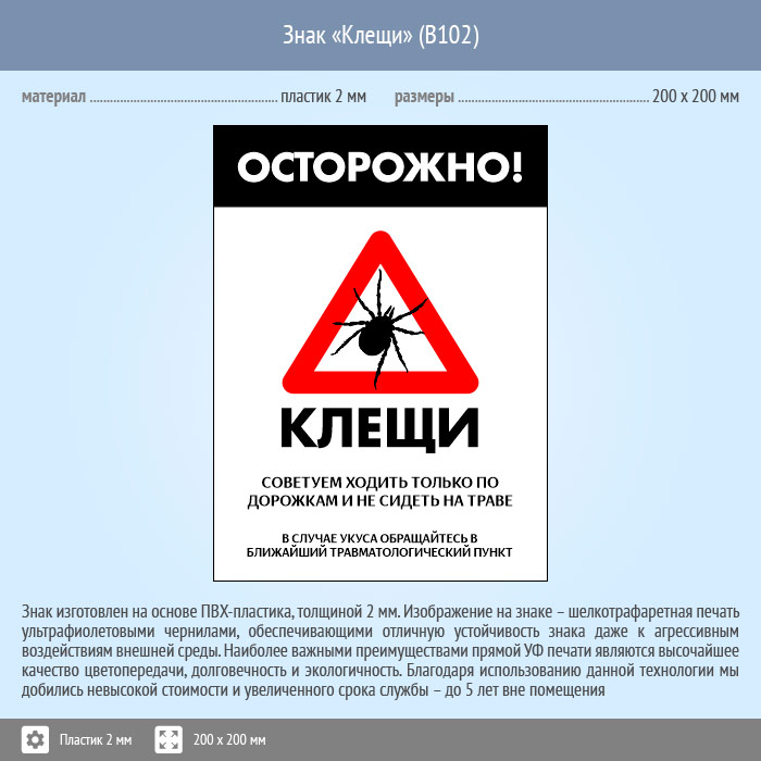 Знак «Осторожно! Клещи», B102 (пластик, 400х600 мм) в Ижевске купить