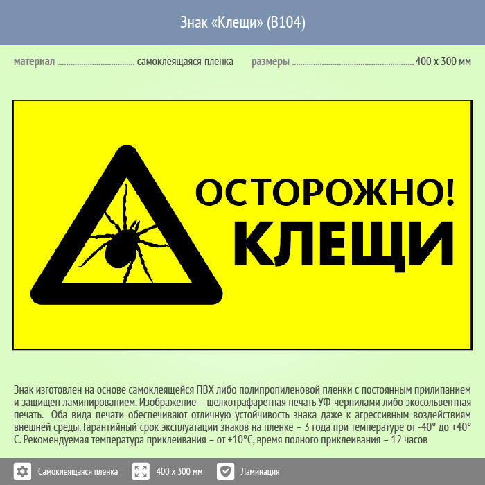 Знак «Осторожно! Клещи», B104 (пленка c ламинированием, 300х200 мм) в Ижевске купить