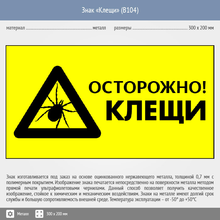 Знак «Осторожно! Клещи», B104 (металл, 400х300 мм) в Ижевске купить