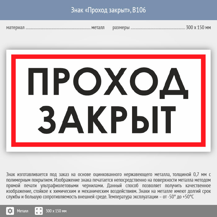 Знак «Проход закрыт», B106 (металл, 300х150 мм) в Ижевске купить