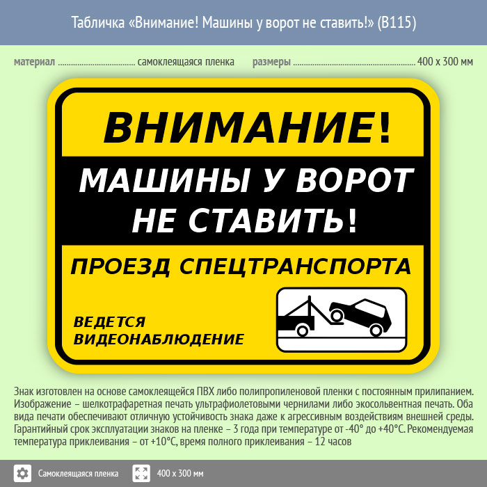 Табличка «Внимание! Машины у ворот не ставить!», B115 (пленка, 400х300 мм) в Ижевске купить