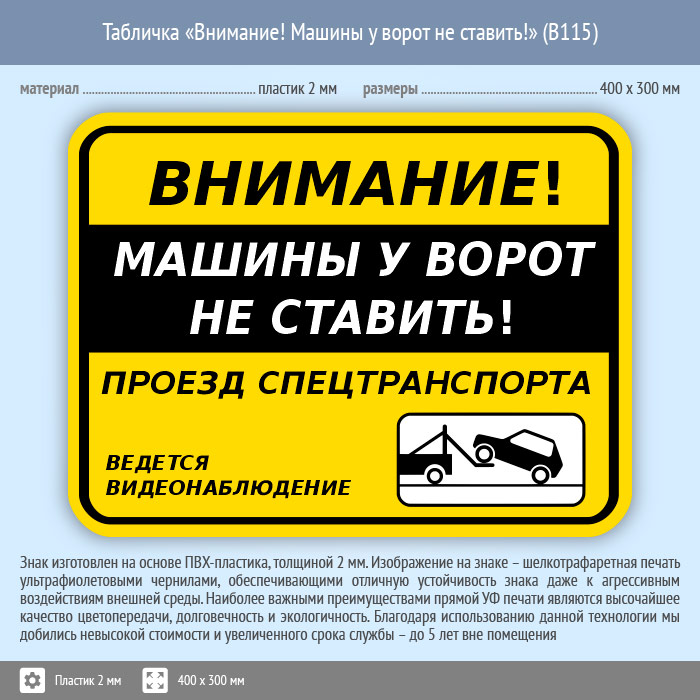 Табличка «Внимание! Машины у ворот не ставить!», B115 (пластик, 400х300 мм) в Ижевске купить