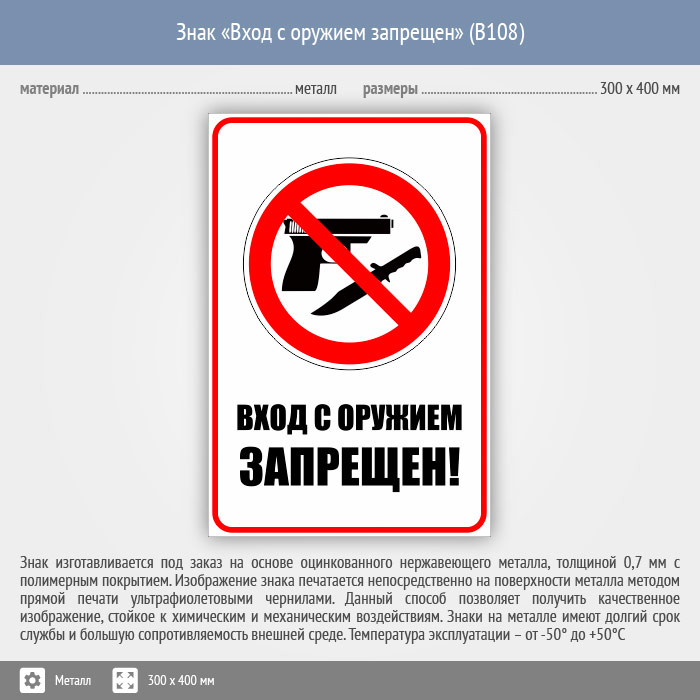 Знак «Вход с оружием запрещен», B108 (металл, 300х400 мм) в Ижевске купить