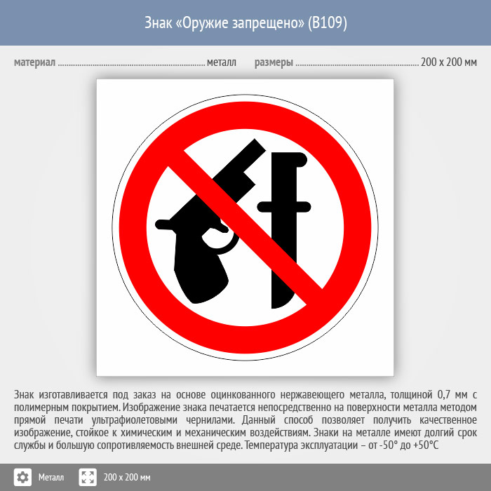 Знак «Оружие запрещено», B109 (металл, 200х200 мм) в Ижевске купить