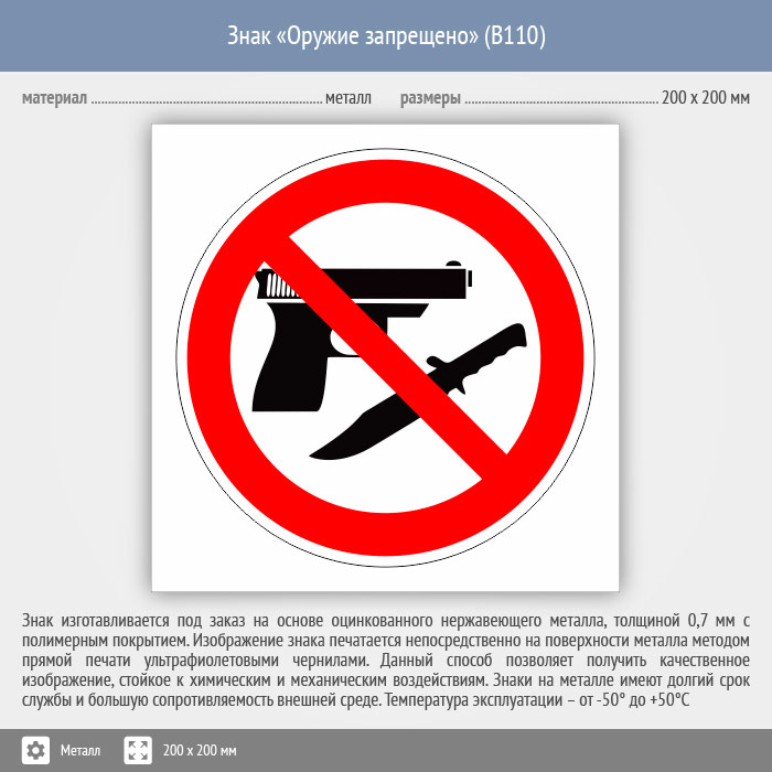 Знак «Оружие запрещено», B110 (металл, 200х200 мм) в Ижевске купить
