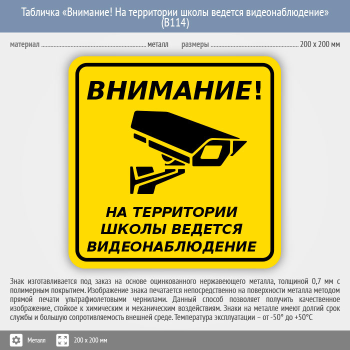 Табличка «Внимание! На территории школы ведется видеонаблюдение», B114 (металл, 200х200 мм) в Ижевске купить