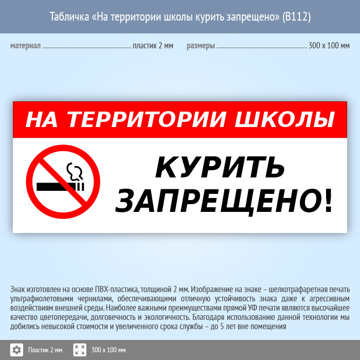 Табличка «На территории школы курить запрещено», B112 (пластик, 300х100 мм) в Ижевске купить