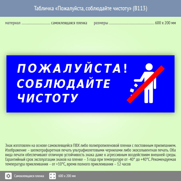 Табличка «Пожалуйста, соблюдайте чистоту», B113 (пленка, 600х200 мм) в Ижевске купить