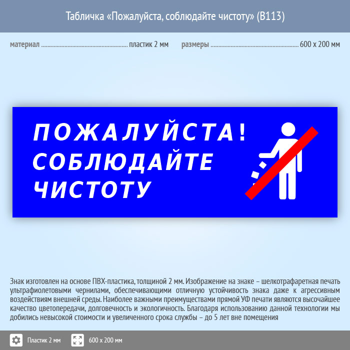 Табличка «Пожалуйста, соблюдайте чистоту», B113 (пластик, 600х200 мм) в Ижевске купить