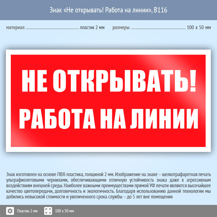 Знак «Не открывать! Работа на линии», B116 (пластик, 100х50 мм) в Ижевске купить