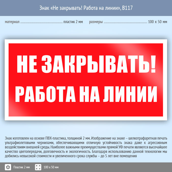 Знак «Не закрывать! Работа на линии», B117 (пластик, 100х50 мм) в Ижевске купить