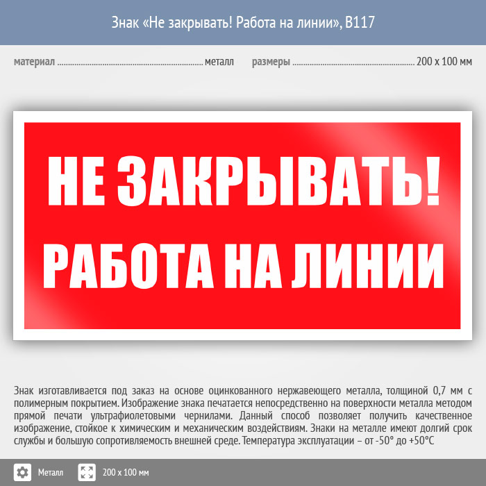 Знак «Не закрывать! Работа на линии», B117 (металл, 200х100 мм) в Ижевске купить