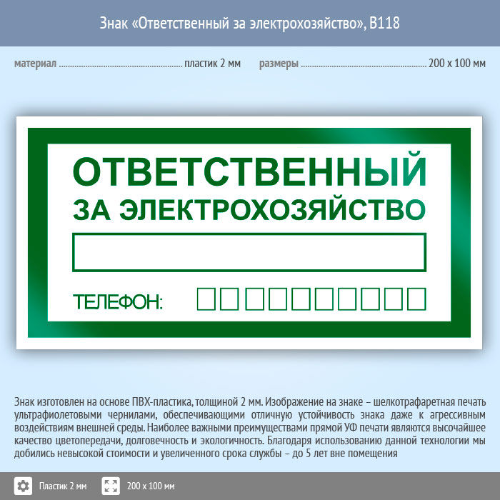 Знак «Ответственный за электрохозяйство», B118 (пластик, 200х100 мм) в Ижевске купить