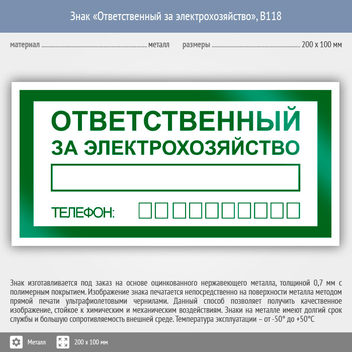 Знак «Ответственный за электрохозяйство», B118 (металл, 200х100 мм) в Ижевске купить