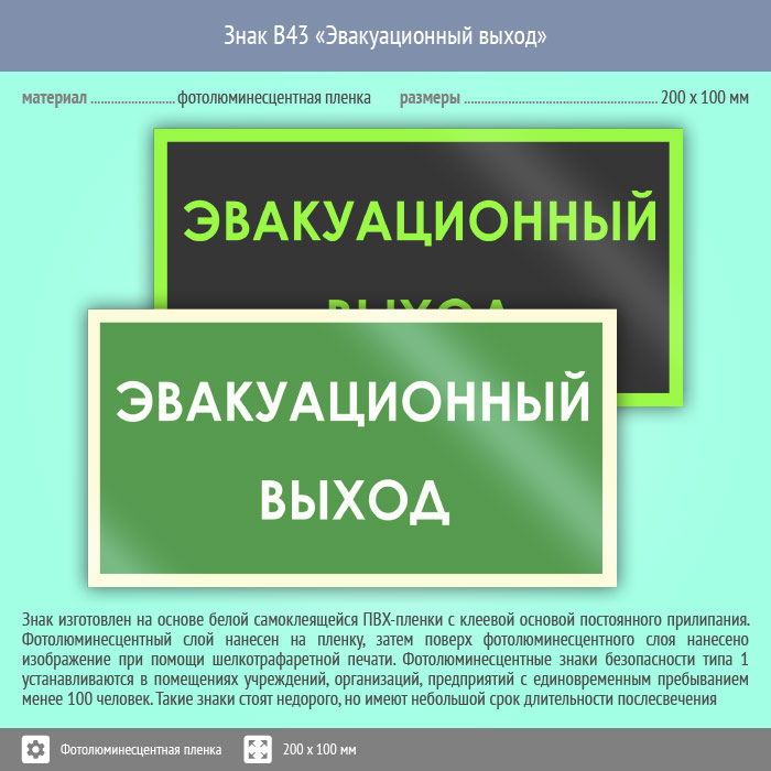 Знак B43 «Эвакуационный выход» (фотолюминесцентная пленка ГОСТ 34428-2018, 200х100 мм) в Ижевске купить