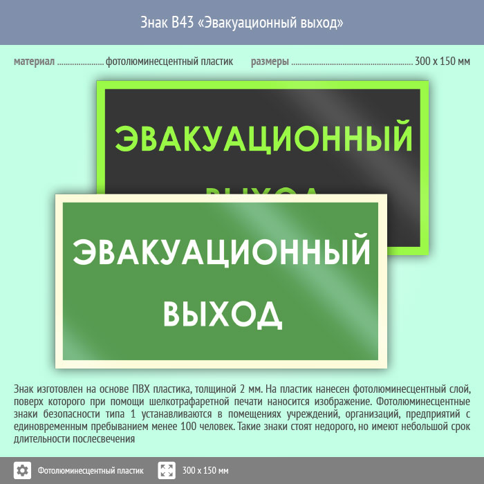 Знак B43 «Эвакуационный выход» (фотолюминесцентный пластик, 300х150 мм) в Ижевске купить