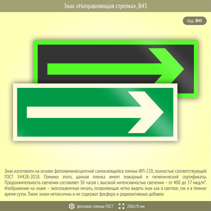 Знак «Направляющая стрелка», B45 (фотолюминесцентная пленка ГОСТ 34428-2018, 200х70 мм) в Ижевске купить