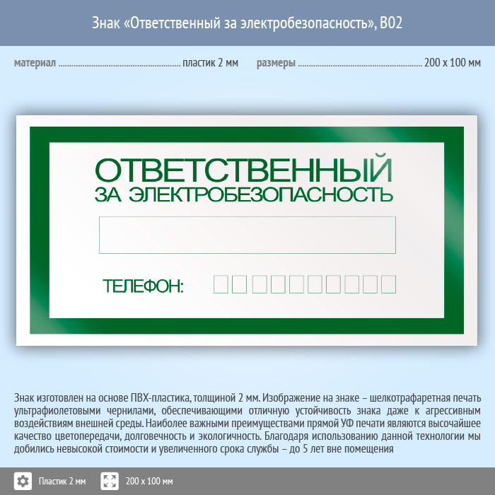 Знак «Ответственный за электробезопасность», B02 (пластик, 200х100 мм) в Ижевске купить
