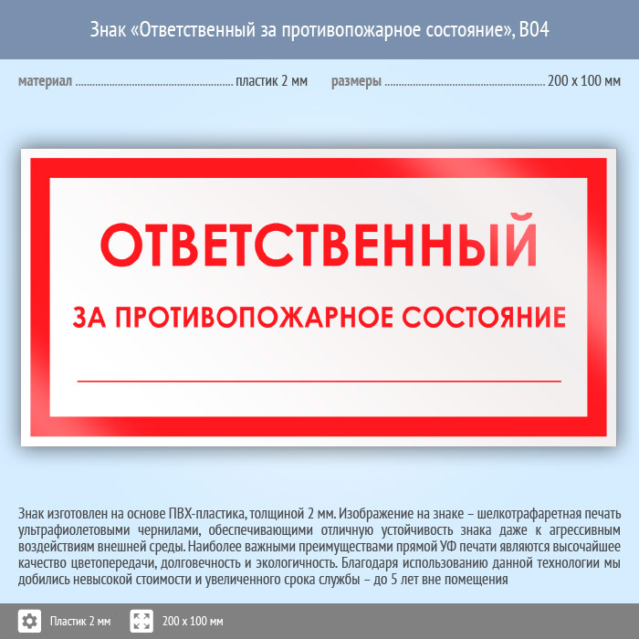 Знак «Ответственный за противопожарное состояние», B04 (пластик, 200х100 мм) в Ижевске купить