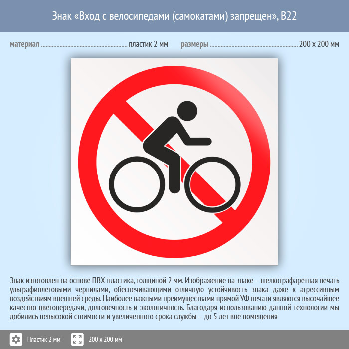 Знак «Вход с велосипедами (самокатами) запрещен», B22 (пластик, 200х200 мм) в Ижевске купить