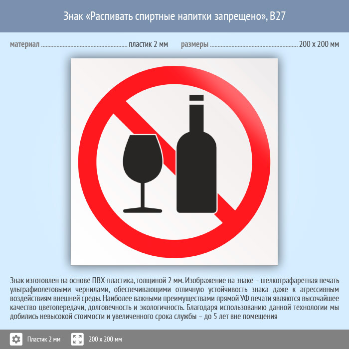 Знак «Распивать спиртные напитки запрещено», B27 (пластик, 200х200 мм) в Ижевске купить