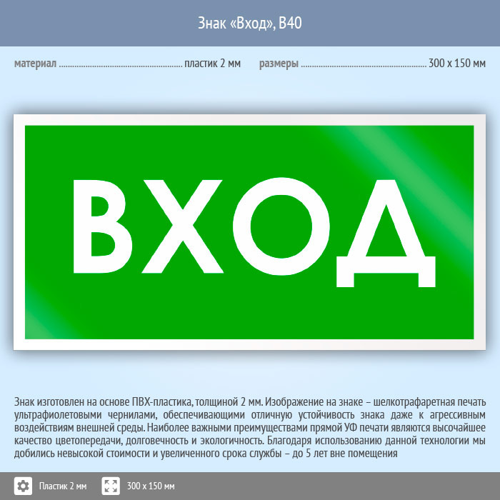 Знак «Вход», B40 (пластик, 300х150 мм) в Ижевске купить
