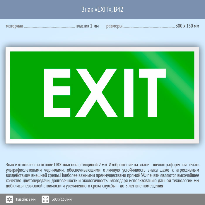 Знак «EXIT», B42 (пластик, 300х150 мм) в Ижевске купить