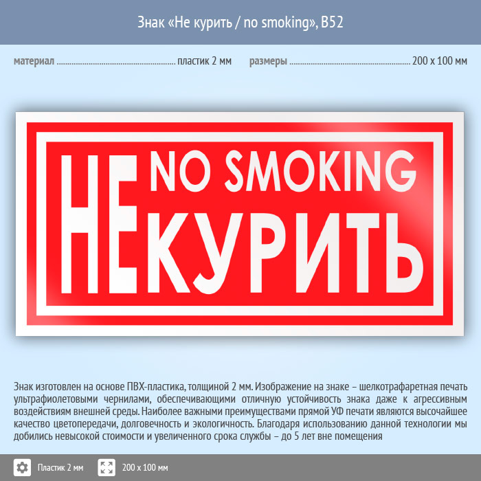 Знак «Не курить / no smoking», B52 (пластик, 200х100 мм) в Ижевске купить