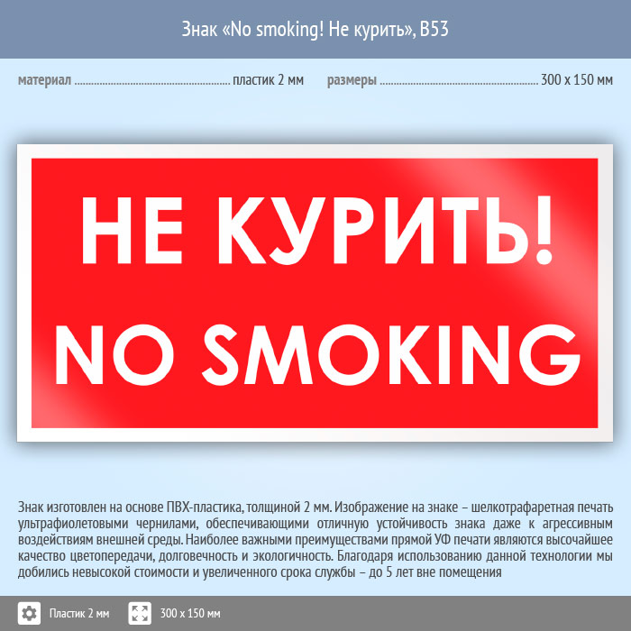 Знак «No smoking! Не курить», B53 (пластик, 300х150 мм) в Ижевске купить