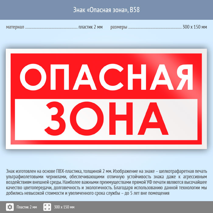 Знак «Опасная зона», B58 (пластик, 300х150 мм) в Ижевске купить