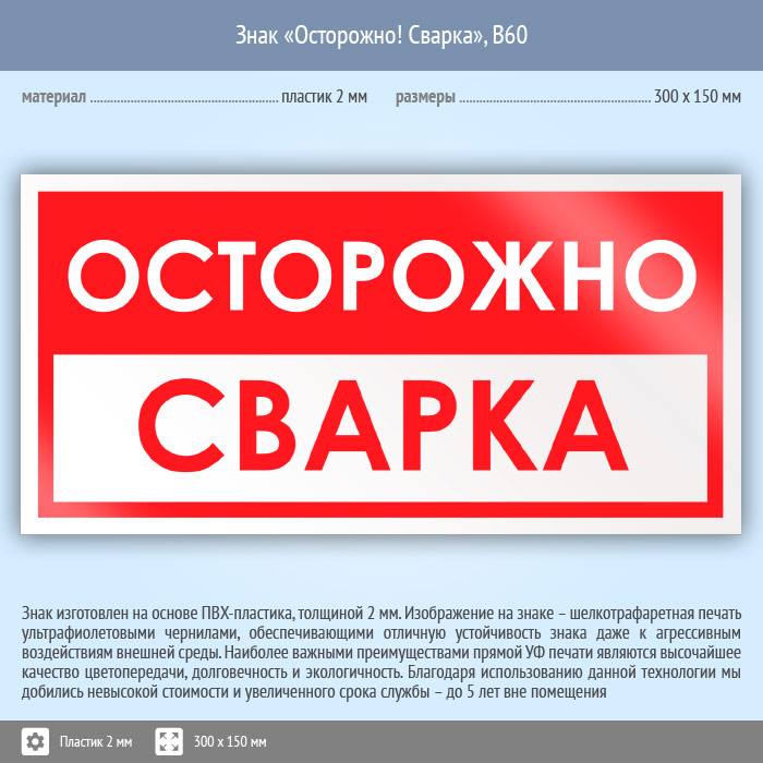 Знак «Осторожно! Сварка», B60 (пластик, 300х150 мм) в Ижевске купить