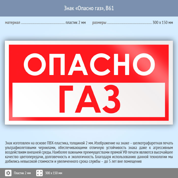 Знак «Опасно газ», B61 (пластик, 300х150 мм) в Ижевске купить