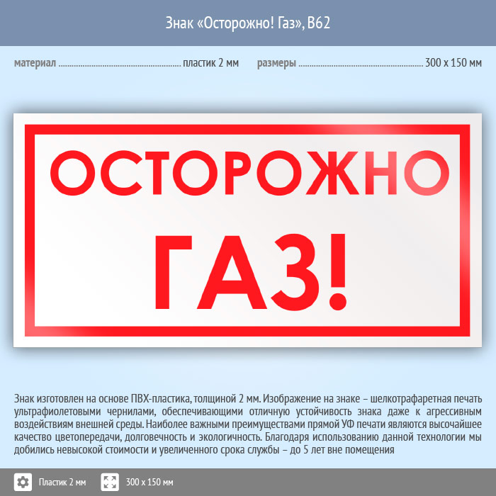 Знак «Осторожно! Газ», B62 (пластик, 300х150 мм) в Ижевске купить