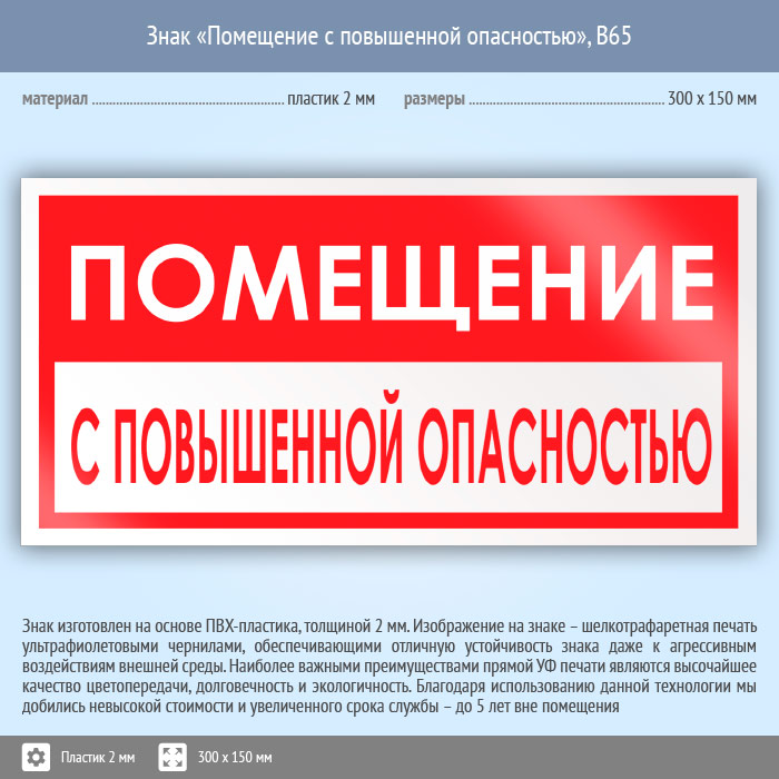 Знак «Помещение с повышенной опасностью», B65 (пластик, 300х150 мм) в Ижевске купить