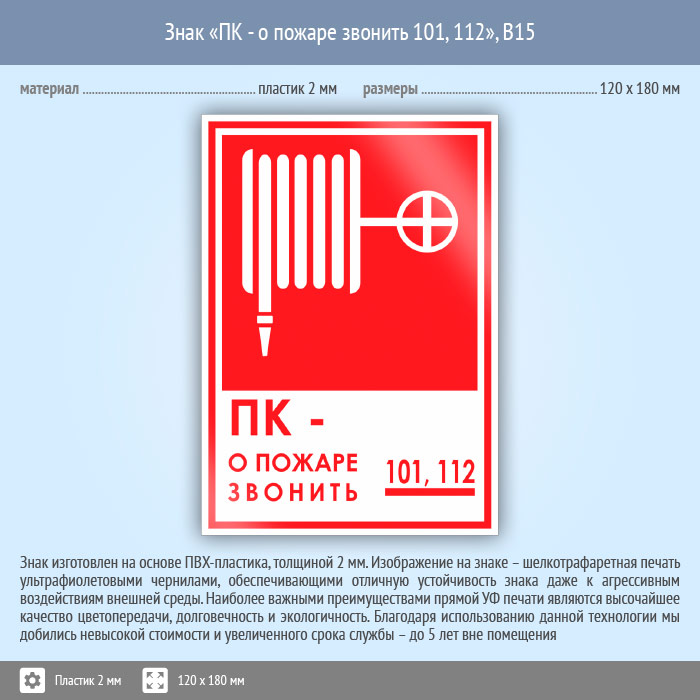 Знак «ПК - о пожаре звонить 101, 112», B15 (пластик, 120х180 мм) в Ижевске купить