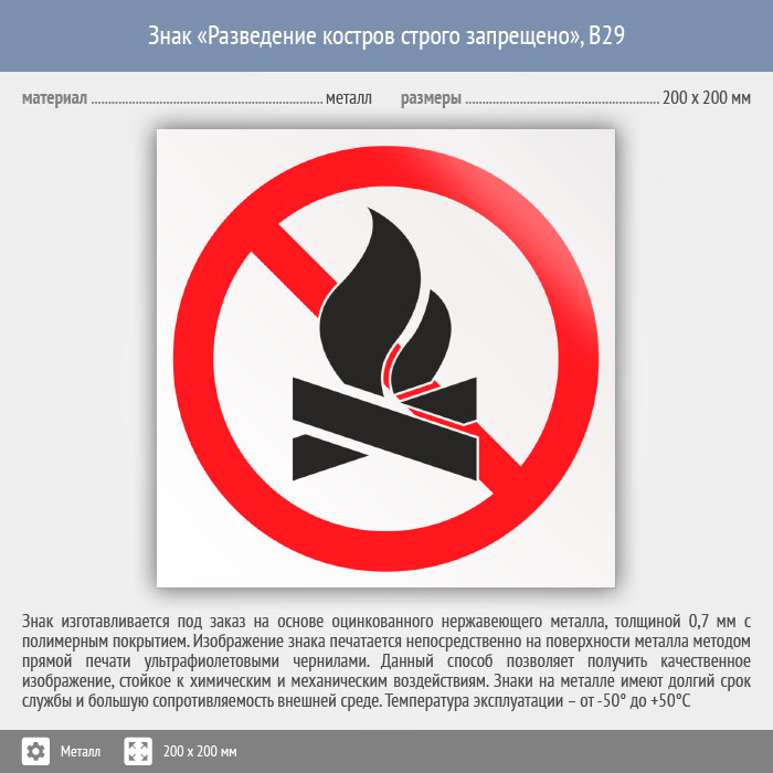 Знак «Разведение костров строго запрещено», B29 (металл, 200х200 мм) в Ижевске купить