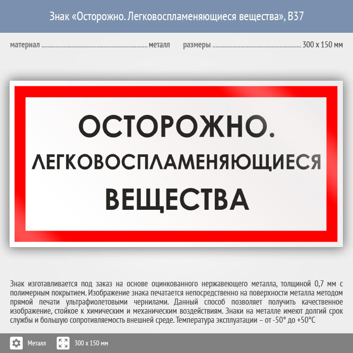 Знак «Осторожно. Легковоспламеняющиеся вещества», B37 (металл, 300х150 мм) в Ижевске купить