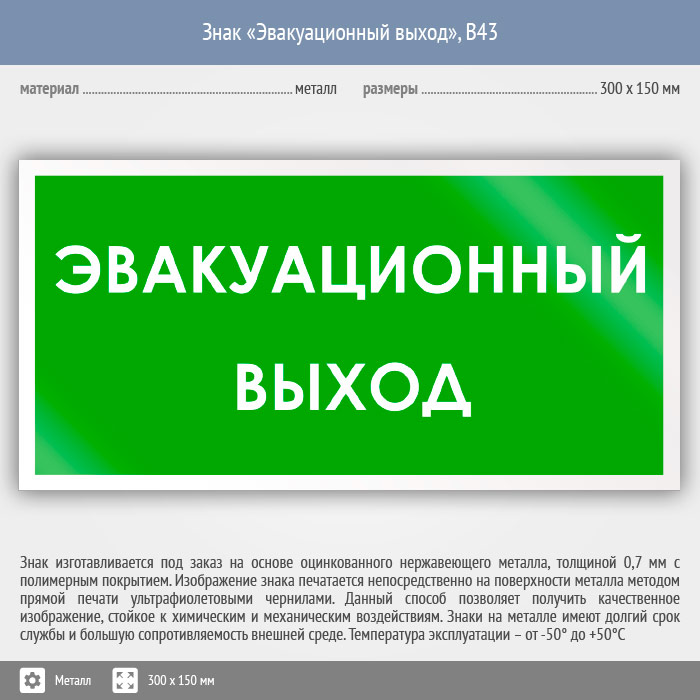 Знак «Эвакуационный выход», B43 (металл, 300х150 мм) в Ижевске купить