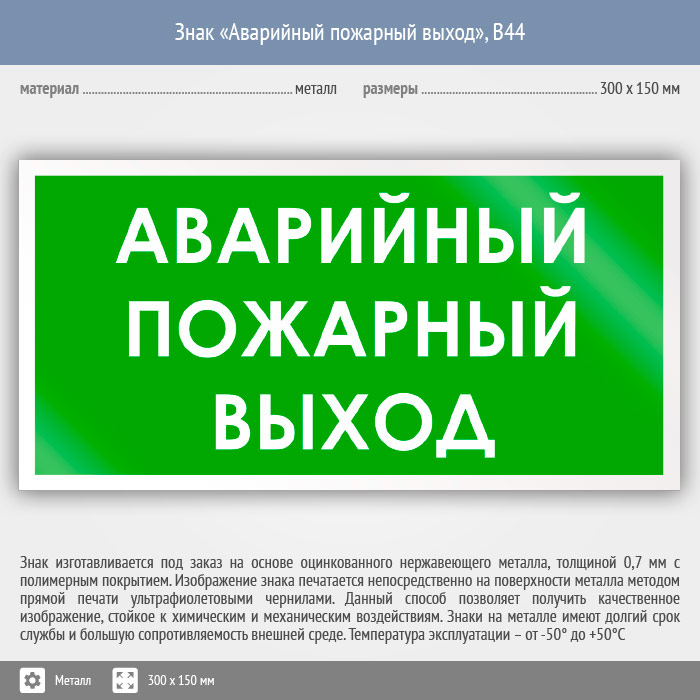 Знак «Аварийный пожарный выход», B44 (металл, 300х150 мм) в Ижевске купить