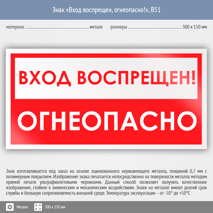 Знак «Вход воспрещен, огнеопасно!», B51 (металл, 300х150 мм) в Ижевске купить