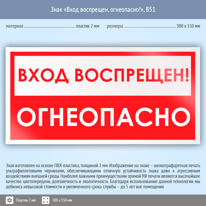 Знак «Вход воспрещен, огнеопасно!», B51 (пластик, 300х150 мм) в Ижевске купить
