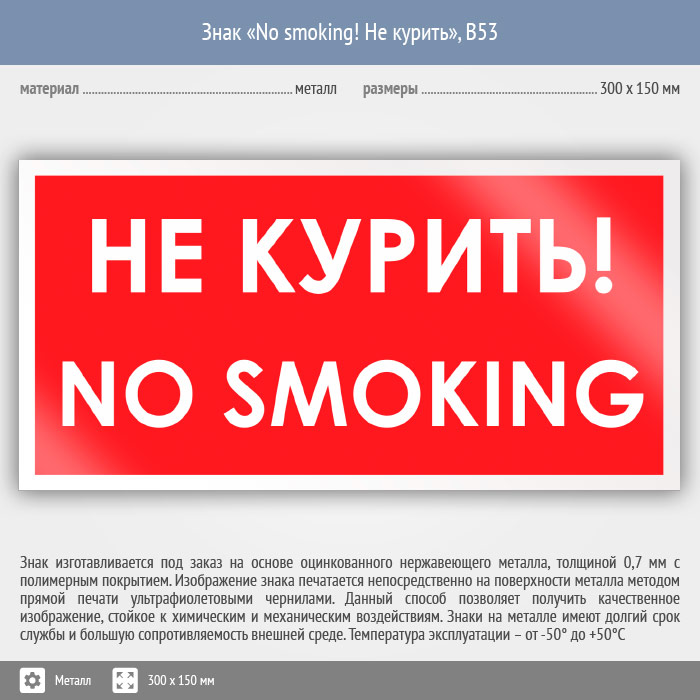 Знак «No smoking! Не курить», B53 (металл, 300х150 мм) в Ижевске купить