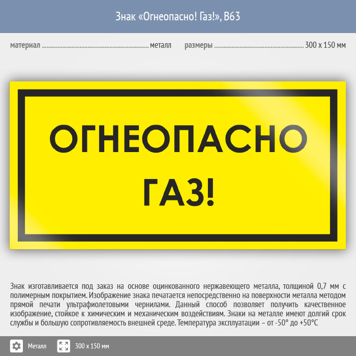 Знак «Огнеопасно! Газ!», B63 (металл, 300х150 мм) в Ижевске купить