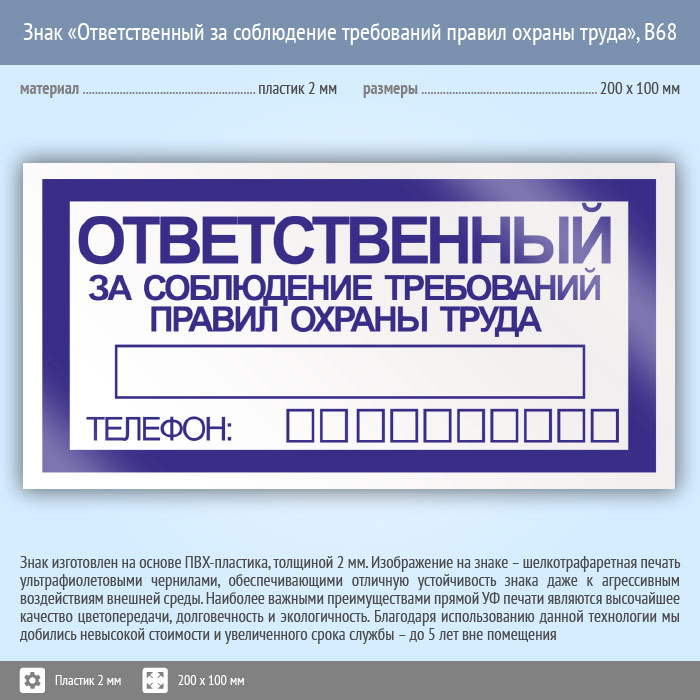 Знак «Ответственный за соблюдение требований правил охраны труда», B68 (пластик, 200х100 мм) в Ижевске купить