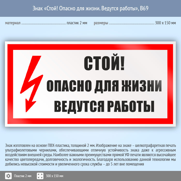 Знак «Стой! Опасно для жизни. Ведутся работы», B69 (пластик, 300х150 мм) в Ижевске купить