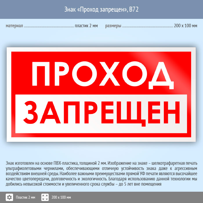Знак «Проход запрещен», B72 (пластик, 200х100 мм) в Ижевске купить