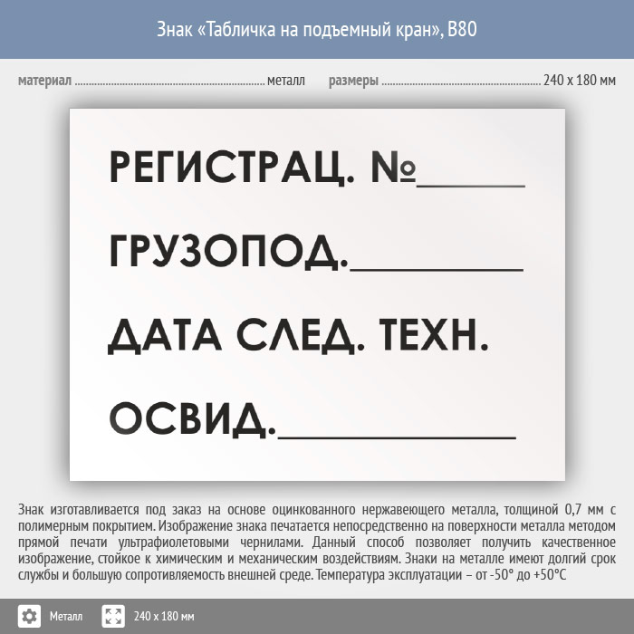 Знак «Табличка на подъемный кран», B80 (металл, 240х180 мм) в Ижевске купить